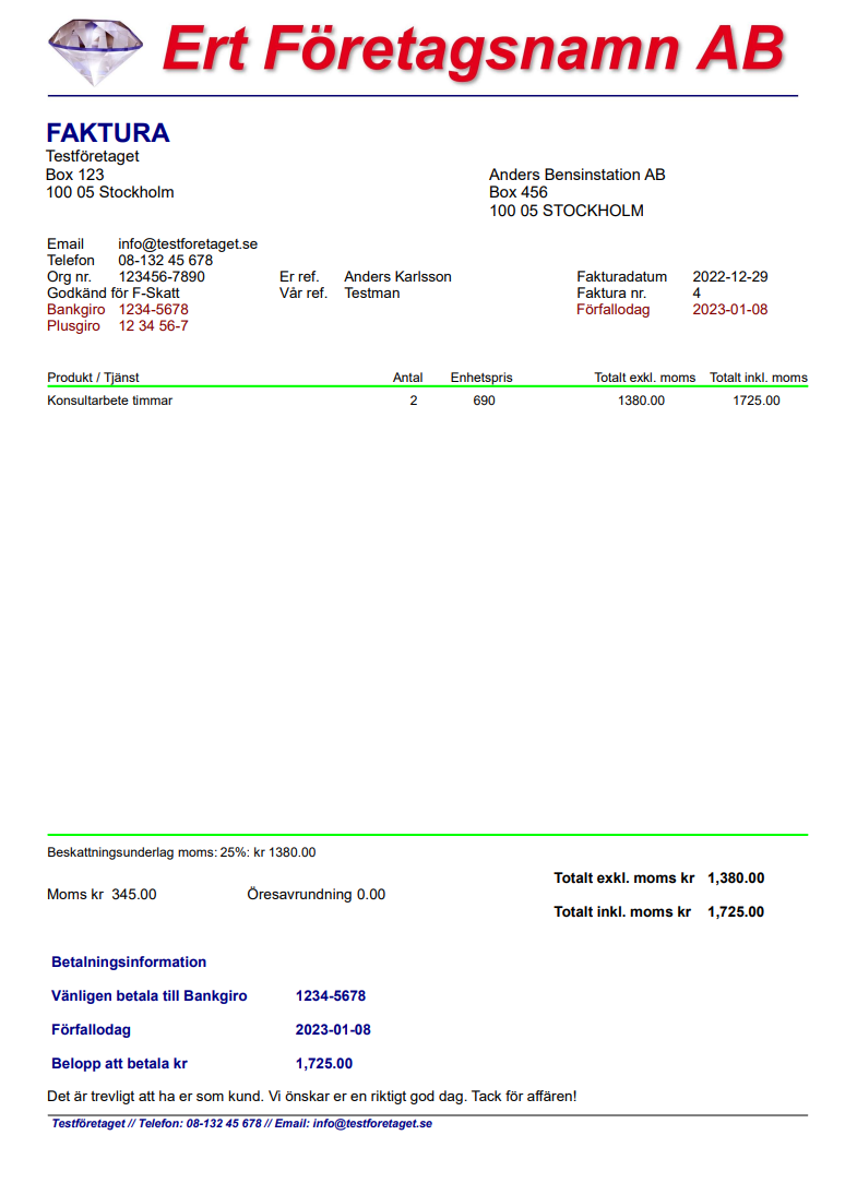 Ett mycket bra fakturaprogram! Vårt företag har använt ert fakturaprogram sen starten i 2005 och är mycket nöjda. Programmet är enkelt att använda och täcker alla våra önskemål i förhållande till egna behov och krav i förhållande till bokföring och översikt. God uppföljning via supporttjänsten vid frågor. Rekommenderas starkt! Ni kan gärna använda texten på hemsidorna. Ha en bra dag!